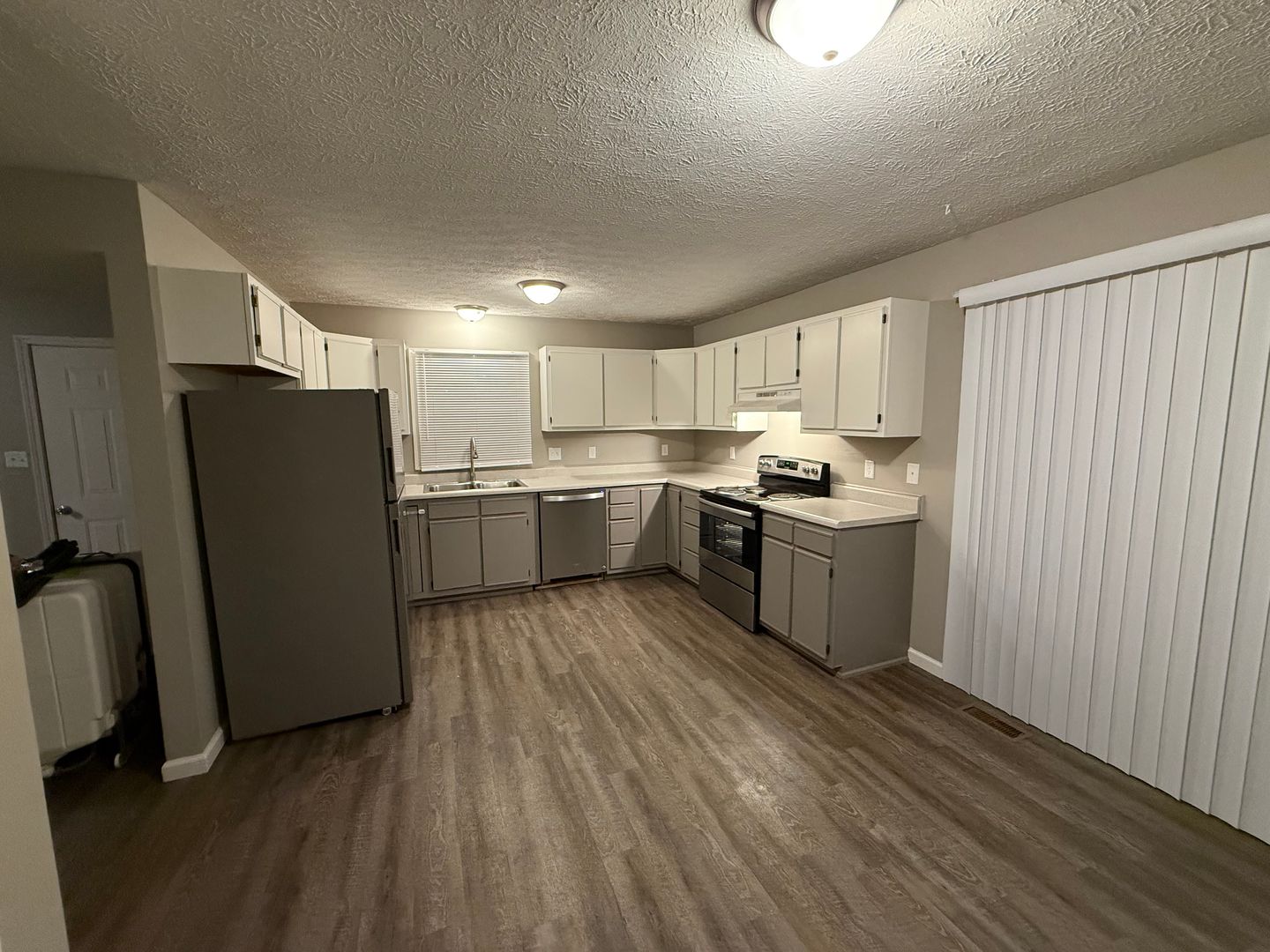 The main level features durable vinyl plank flooring, while the upper level is carpeted throughout. The modern kitchen showcases two-tone gray and white cabinetry and is fully equipped with stainless steel appliances, including an electric range, refrigerator, and dishwasher. A half bathroom is conveniently located on the main floor. Just off the kitchen, residents can enjoy a spacious backyard patio, ideal for small, quiet gatherings.